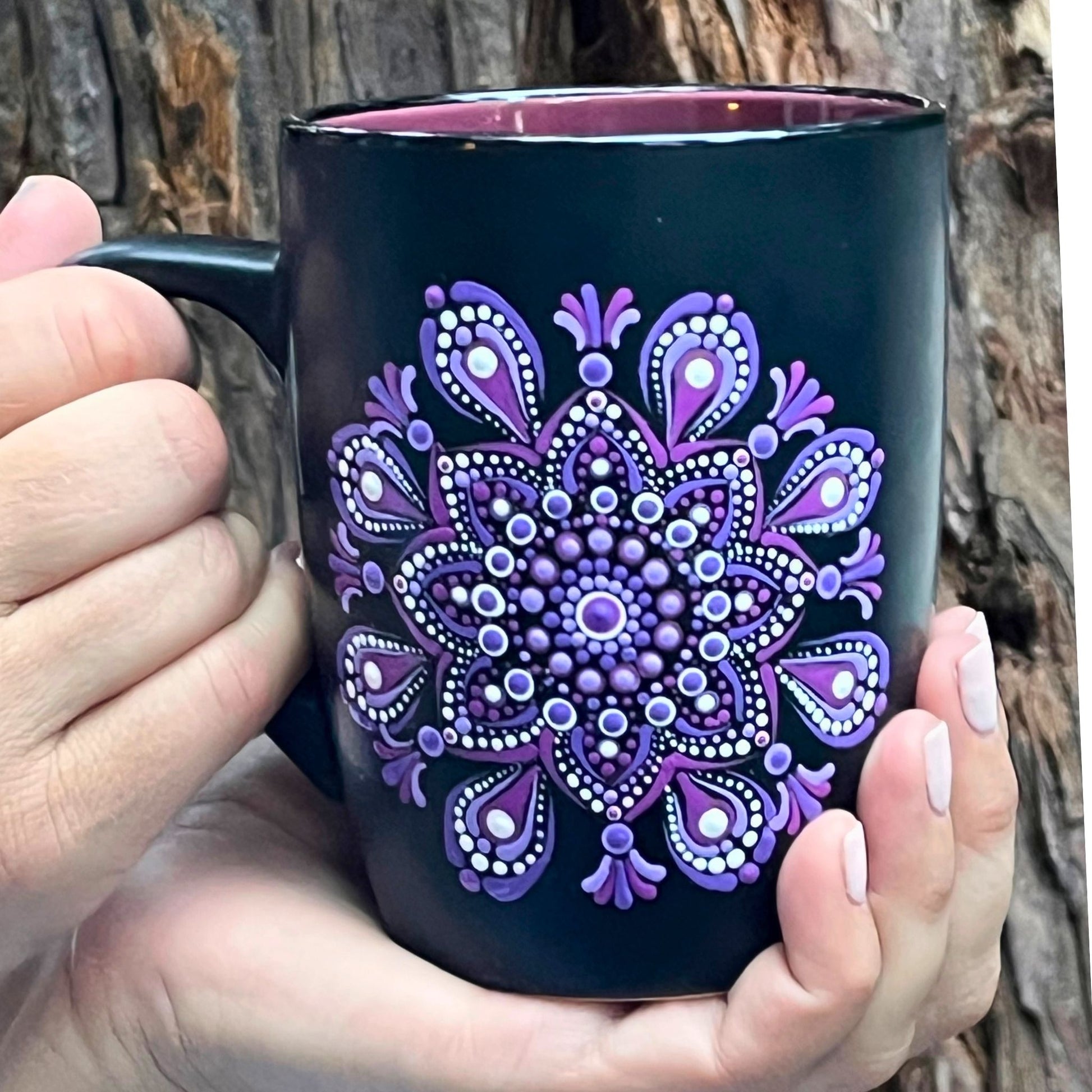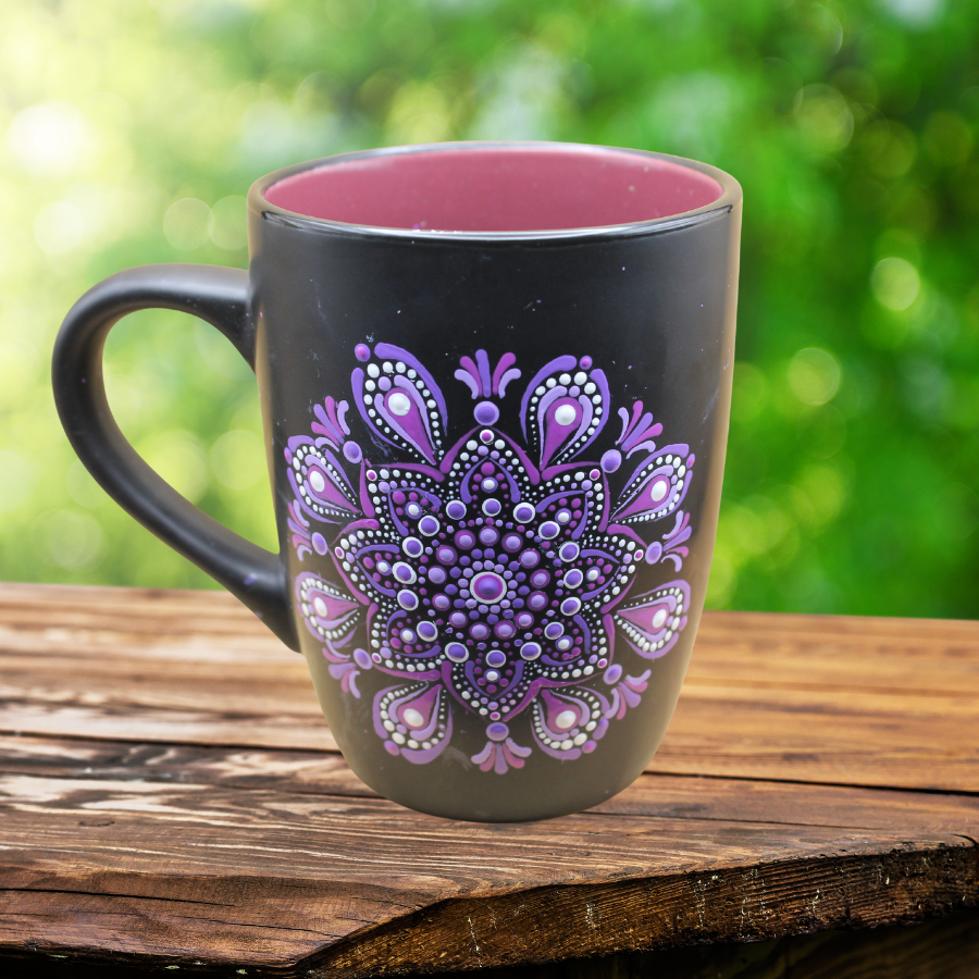 Hand painted with acrylic enamel paint heat cured. This 16oz. mug is the perfect size for your morning cup of tea or coffee and is a beautiful addition to any table. Given the handmade nature of the product, there may be some imperfections but as Bob Ross once said they "happy little accidents" and add rather than detract to the beauty of the design.