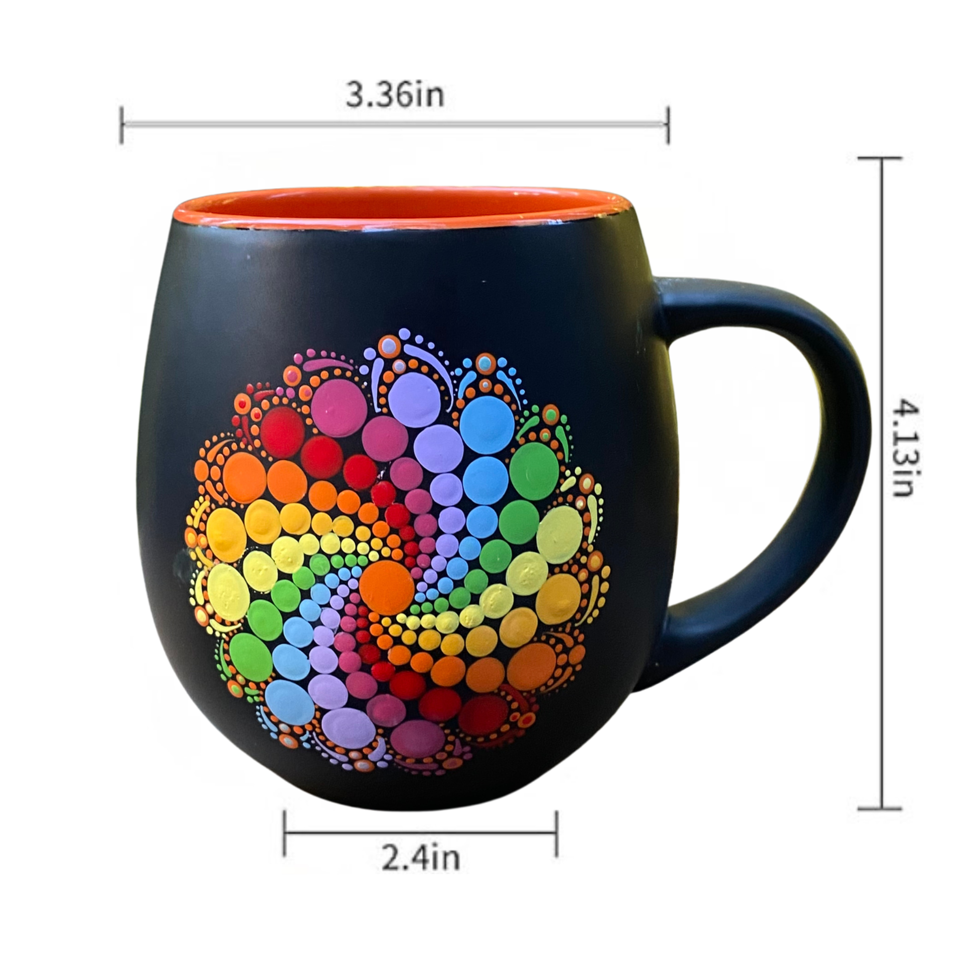 Part of the Caffeinated Kaleidoscope Collection, Neon Current pulses with confident, modern energy. Its vibrant swirl radiates from a bold Orange Center dot, finished with a vivid orange center interior for an extra pop. Crafted dot by dot against a matte black backdrop, its functional art with personality.