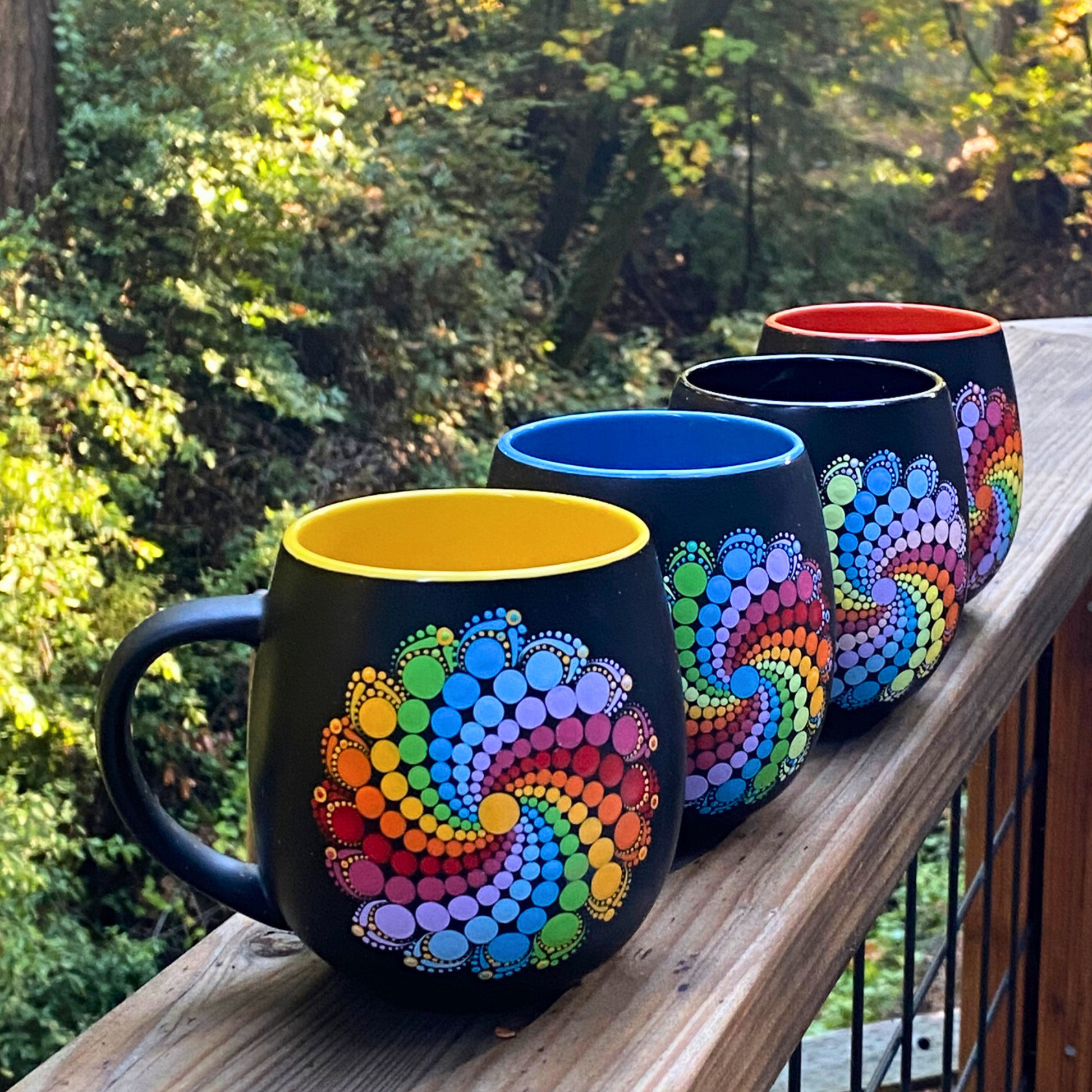 Part of the Caffeinated Kaleidoscope Collection, Solar Spin radiates bright, uplifting energy through its rainbow spiral in motion. Featuring a yellow center dot and a yellow interior, this mug feels vibrant from the inside out. Hand-painted dot by dot in my signature mandala style, no two are exactly alike — just like the mornings that begin with it.